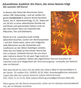 adventlich leuchtet, suchen wir Sternenspender auf Zeit.Schön wäre, wenn sich möglichst viele Menschen aus der Gemeinde und rundherum an der Aktion beteiligen würden.